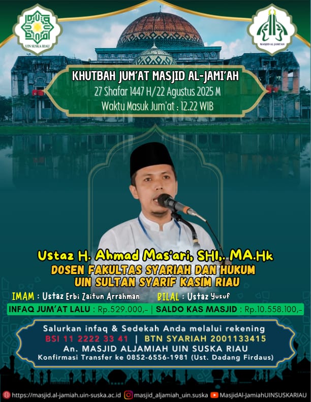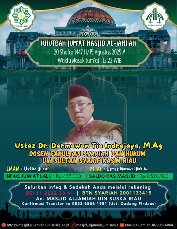Petugas Shalat Jum’at di Masjid Al Jami’ah UIN Sultan Syarif Kasim Riau 20 Shafar 1447 H/15 Agustus 2025 M Waktu masuk jum’at : 12.22 WIB Khatib : Ustaz Dr. Darmawan Tia Indrajaya, M.Ag Dosen Fakultas Syariah dan Hukum UIN Suska Imam : Ustaz Yusuf Muazzin/Bilal : Ustaz Marawal Habibi Infaq Jum’at lalu : Rp. 457.000...Read More