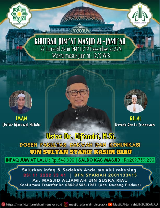Petugas Shalat Jum’at di Masjid Al Jami’ah UIN Sultan Syarif Kasim Riau 23 Jumadil Ula 1447 H/14 November 2025 M Waktu masuk jum’at : 12.02 WIB Khatib : Ustaz Dr. Adynata, MA Dosen Fakultas Ushuluddin Imam : Ustaz Muhammad Syaputra Muazzin/Bilal : Ustaz Restu Trisnawan Infaq Jum’at lalu : Rp. 467.000,- Saldo Kas Masjid (BSI)...
