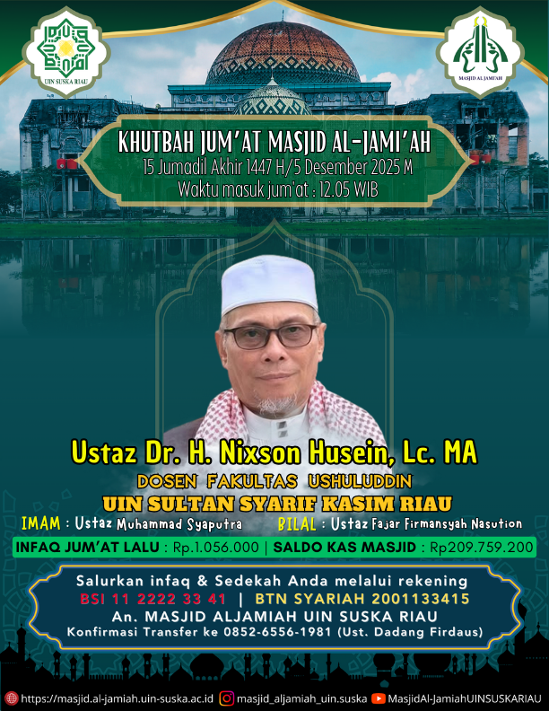 Petugas Shalat Jum’at di Masjid Al Jami’ah UIN Sultan Syarif Kasim Riau 15 Jumadil Akhir 1447 H/5 Desember 2025 M Waktu masuk jum’at : 12.05 WIB Khatib : Ustaz Dr. H. Nixson Husein, Lc. MA Dosen Fakultas Ushuluddin Imam : Ustaz Muhammad Syaputra Muazzin/Bilal : Ustadz Fajar Firmansyah Nasution Infaq Jum’at lalu : Rp. 1.056.000,-...