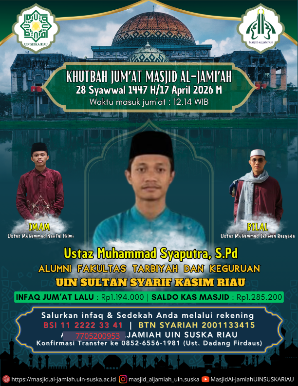 Terimakasih wa Jazakumullahu khairan atas infaq Bapak/Ibu dan jama’ah ke Masjid Al-Jami’ah UIN SUSKA Riau.
